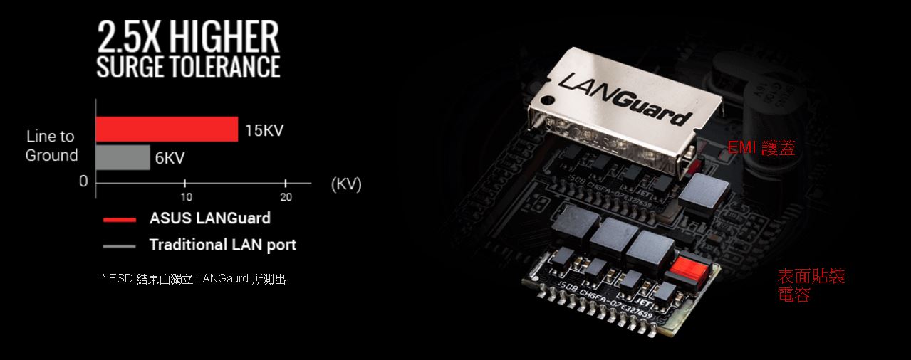 ASUS LANGuard 是一種硬體層級網路保護,運用訊號耦合技術與優質的抗 EMI 表面貼裝電容,確保極度可靠的網路遊戲連線品質和更高的傳輸量,靜電保護與突波防護元件則可提供更佳的靜電耐受性及更強的突波防護。